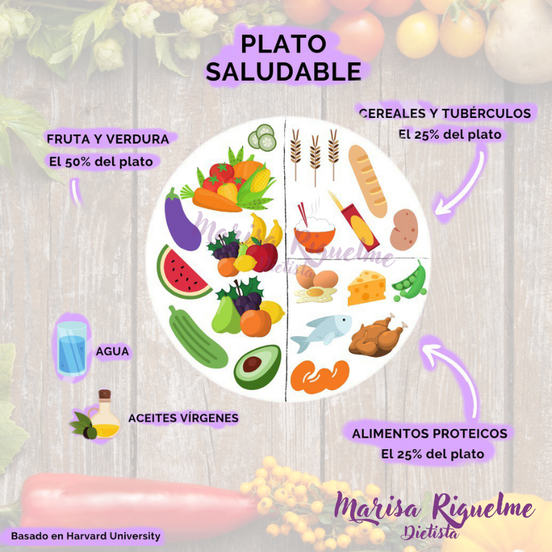 • Grupo de alimentos proteicos: Legumbres, carne, pescado, huevos y lácteos el 25% del plato.